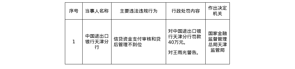 罚单显示,中国进出口银行天津分行的主要违法违规事实是:信贷资金支付审核和贷后管理不到位。